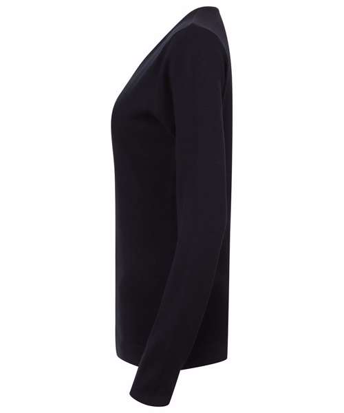 Fine knit 12 gauge v-neck jumper. Tube knit waist and cuff. Semi fashioned sleeve and neck detail.
