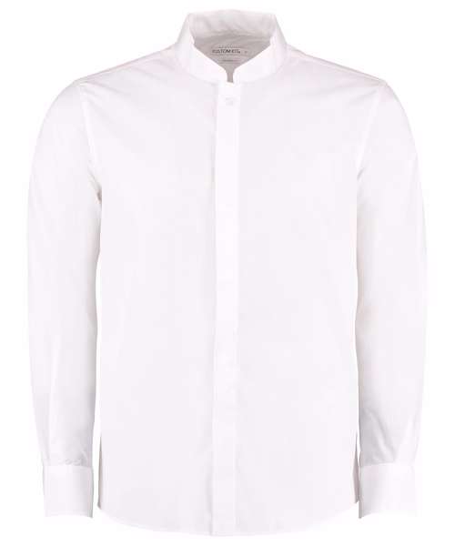 Soft interlined fused mandarin collar. Concealed front placket. Rounded hem. Single-stitched front and back yoke and armholes. Double-stitched side and sleeve seams. Two pleats at the back. 1-button adjustable cuff with button cuff placket. Spare buttons. Kustom Kit® woven back neck label.