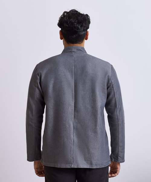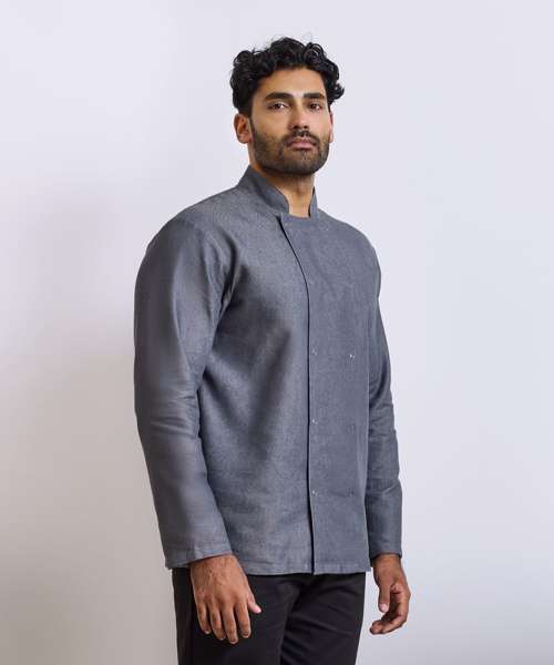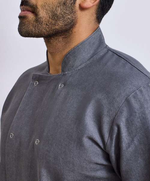 Long sleeve unisex chef's jacket with a cross over fastening at the front. Ten popper stud fasteners for a simple and easy-wearing jacket. Mandarin collar stand with top stitching.