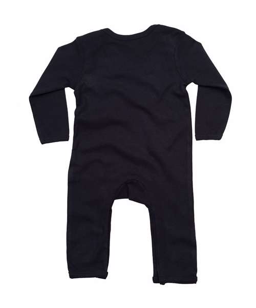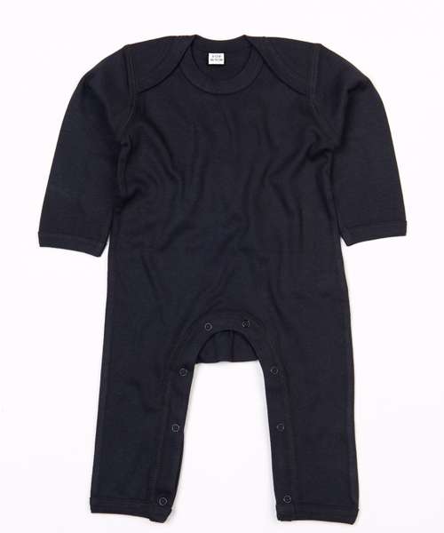 Long sleeved, full body romper suit. Envelope neck opening. Binding at cuffs, ankles and neck. Self colour nickel free poppers at leg. Neutral neck label. Oeko-Tex certified. GOTS certified. Vegan certified.