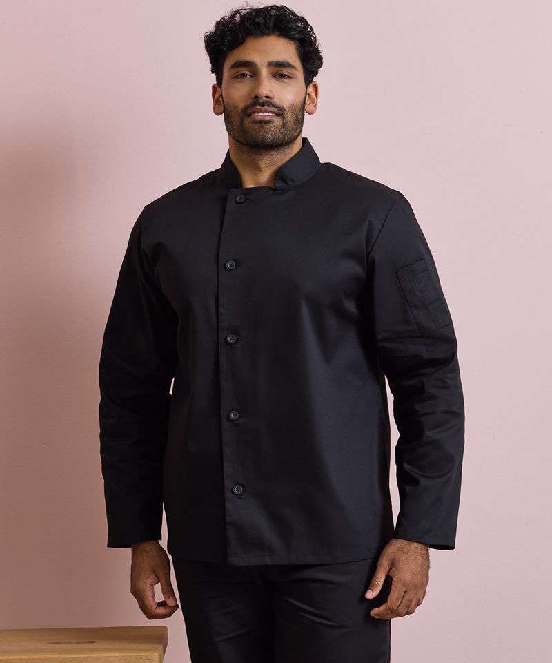 A durable long sleeve chef's jacket that fastens down the right hand side of the body with five long life resin buttons. On the upper left sleeve there is a handy double pocket pen compartment. This jacket is styled with a mandarin collar and is available in Black and White and offers great value for money.