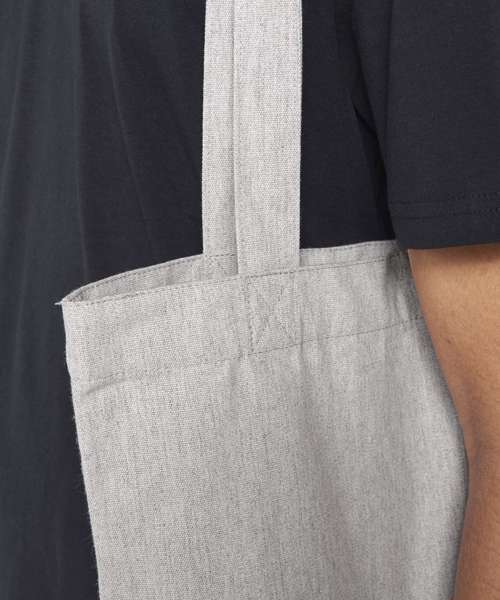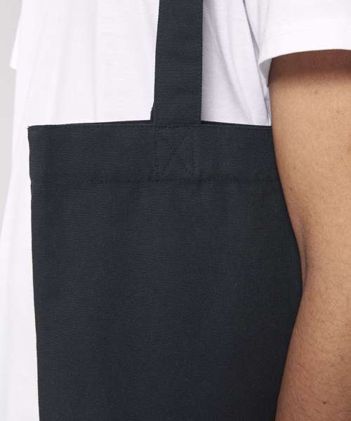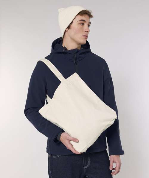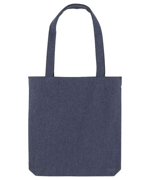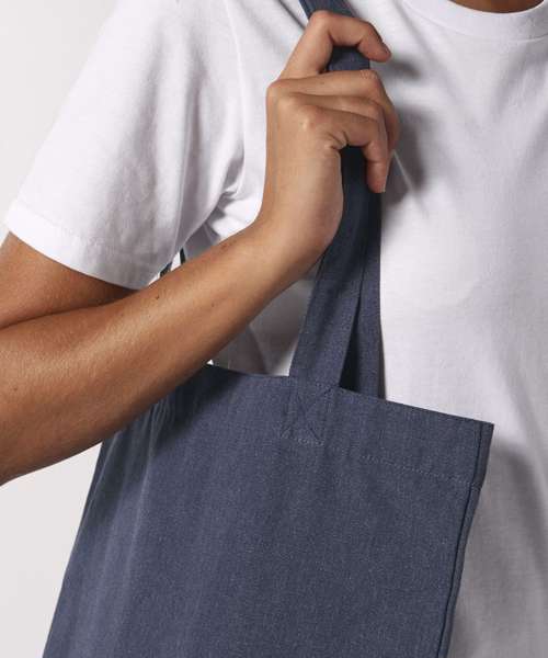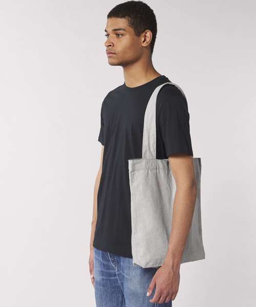 Top edge double folded for strength and clean finish. long handles with reinforced cross stitch. Shaping seam at bottom to create volume. Unisex. 80% recycled cotton, 20% recycled polyester. Canvas.