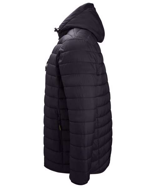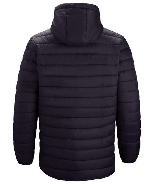 Insulated zip-through jacket with hood, chest pocket and narrow baffles. Water-resistant. Zipped pockets. UKAS certified. ISO certified.