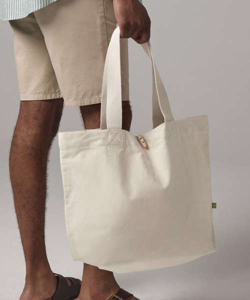 Premium heavyweight fabric. Natural wooden toggle closure. Cotton webbing carry handles. Can be carried by hand or over the shoulder. Handle length: 60cm. 100% Certified organic cotton.