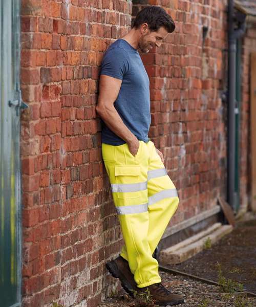 Hi Vis Yellow and Orange conforms to EN ISO 20471 Class 1 and Orange is also RIS-3279-TOM Railway use certified. Black and Navy provide enhanced visibility. Made of 280 gsm water-repellent anti-pill single jersey knitted soft-feel polyester fabric. Fully elasticated waist with well-made drawcord. Two 5cm width retro reflective tapes bands higher up to the mid thigh. Cargo pocket with hook and loop fastening flap on both legs. Two Hip pockets with zip closure. One rear patch pocket with hook and loop fastening flap. Elasticated ankles. Comfortable to wear allowing maximum movement without restriction.